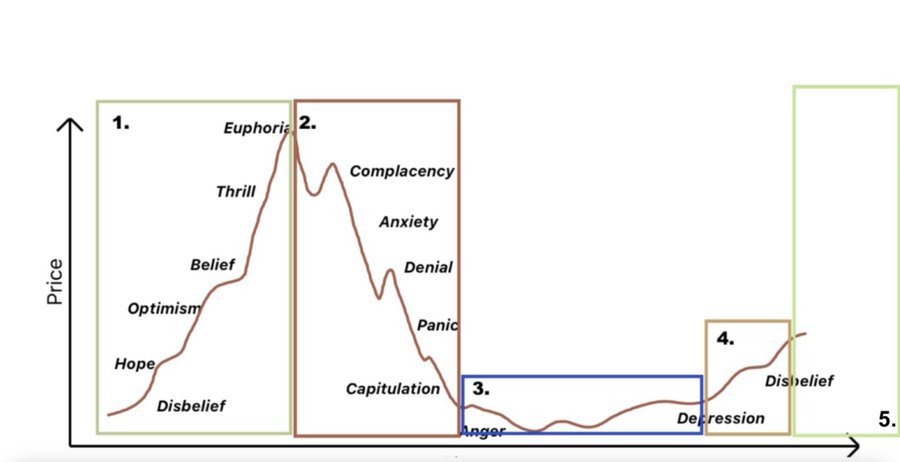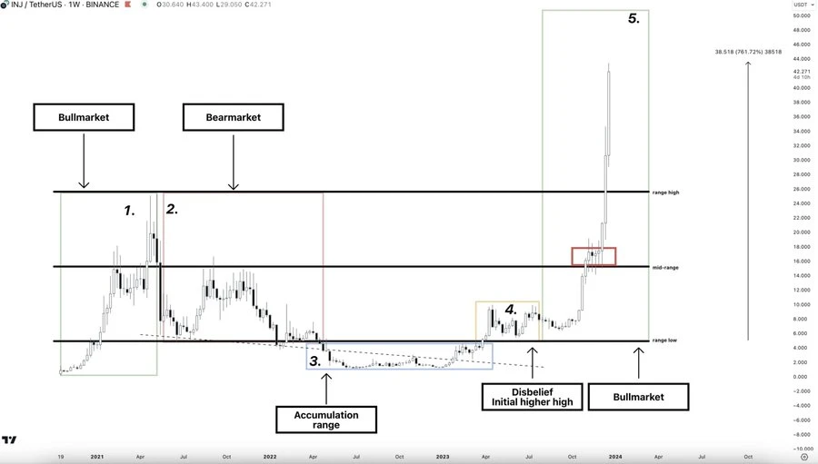 第 4 阶段是初始高点的突破,趋势转变,而第 5 阶段是牛市出现抛物线上涨的地方。