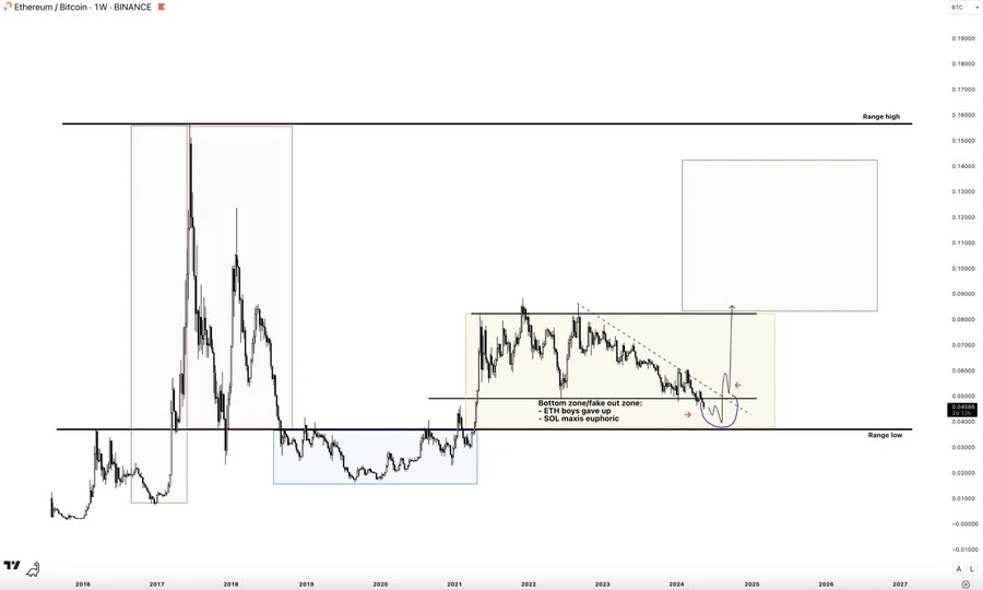 ETH/BTC 正在进入区间低点,处于第 4 阶段,这是反转区域。在上个周期,ETH 对 BTC 的交易一直处于疑虑期。想象一下,如果她进入了第 5 阶段:抛物线上涨阶段,本周期将会是怎样。反转意味着山寨币的上涨,这种上涨会扩展到更广泛的市场中。
