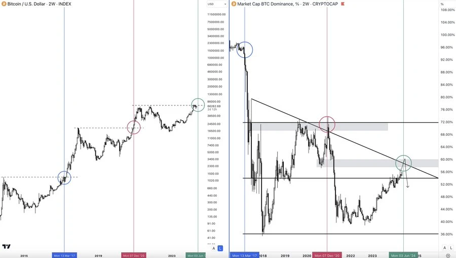 历史上,当 BTC 大幅上涨并创下新高时,这标志着其主导地位的顶点。虽然 BTC 可能会先走得更高,但事实是,本周期以来它一直处于上涨趋势,这表明山寨币尚未经历过它们的牛市周期。