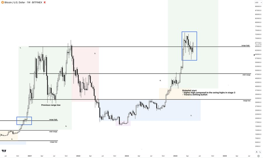 所有资产,在任何时间框架内,都会呈现出相似的周期结构。重点关注周线周期,这是我们通常所指的高时间框架上的牛市。