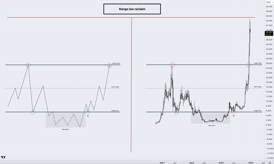 正如你所看到的,BTC 在重新占领区间低点后已经触及了区间高点。