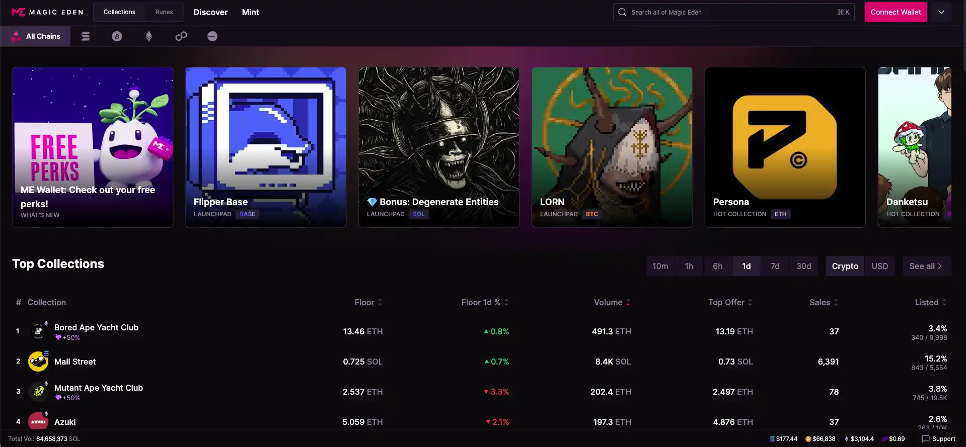当时 NFT 在 Solana 上非常流行,因此 Magic Eden 最开始,且大约有一年的时间里都专注于 Solana 市场。目前,Magic Eden 已深入比特币、Polygon 等其他链,尤其是与比特币生态的紧密联系几乎让它成为「王者」。据 DappRadar 数据,Magic Eden NFT 市场的 24 小时交易额达到 676 万美元,仅低于 Blur 1593 万美元的 24 小时交易额,成为交易额第二大的 NFT 市场。