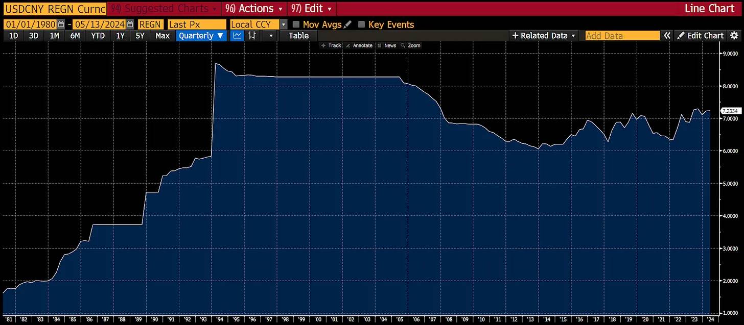 中国人民银行(PBOC)自 1994 年以来基本上将人民币与美元挂钩,略有加强倾向。这就是这张 USDCNY 图表所显示的。这种情况即将改变。