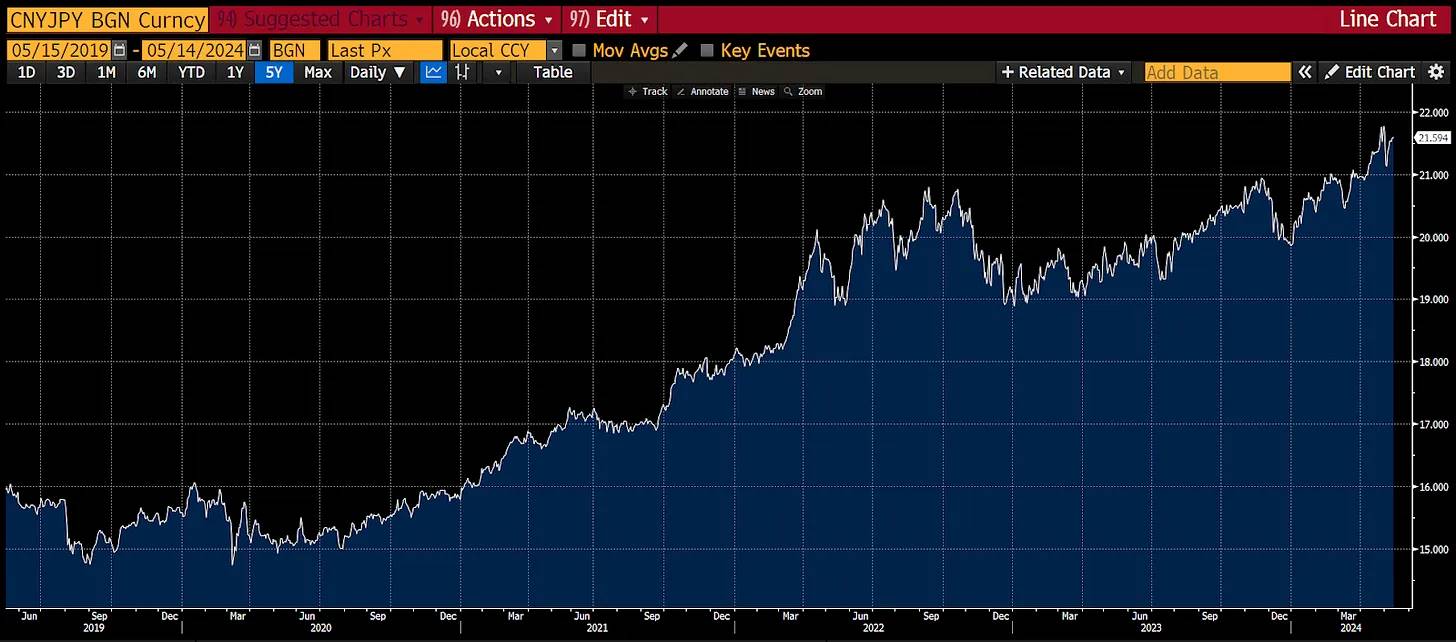中国不会喜欢这个人民币兑日元的汇率图。