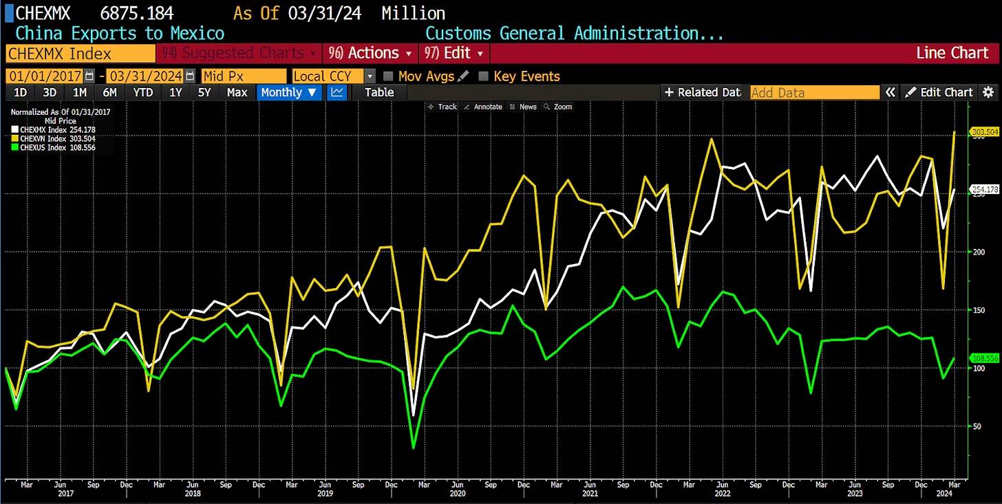 这是中国对墨西哥(白色)、越南(黄色)和美国(绿色)的出口图表。特朗普的任期始于 2017 年,这是该指数的起始日期,值为 100 。中国与墨西哥之间的贸易增长了 154% ,与越南之间的贸易增长了 203% ,但与美国的贸易仅增长了 8% 。显然,与美国的贸易价值远高于墨西哥和越南,但很明显,中国正在利用这两个国家作为商品通过其边界进入美国的中转站。