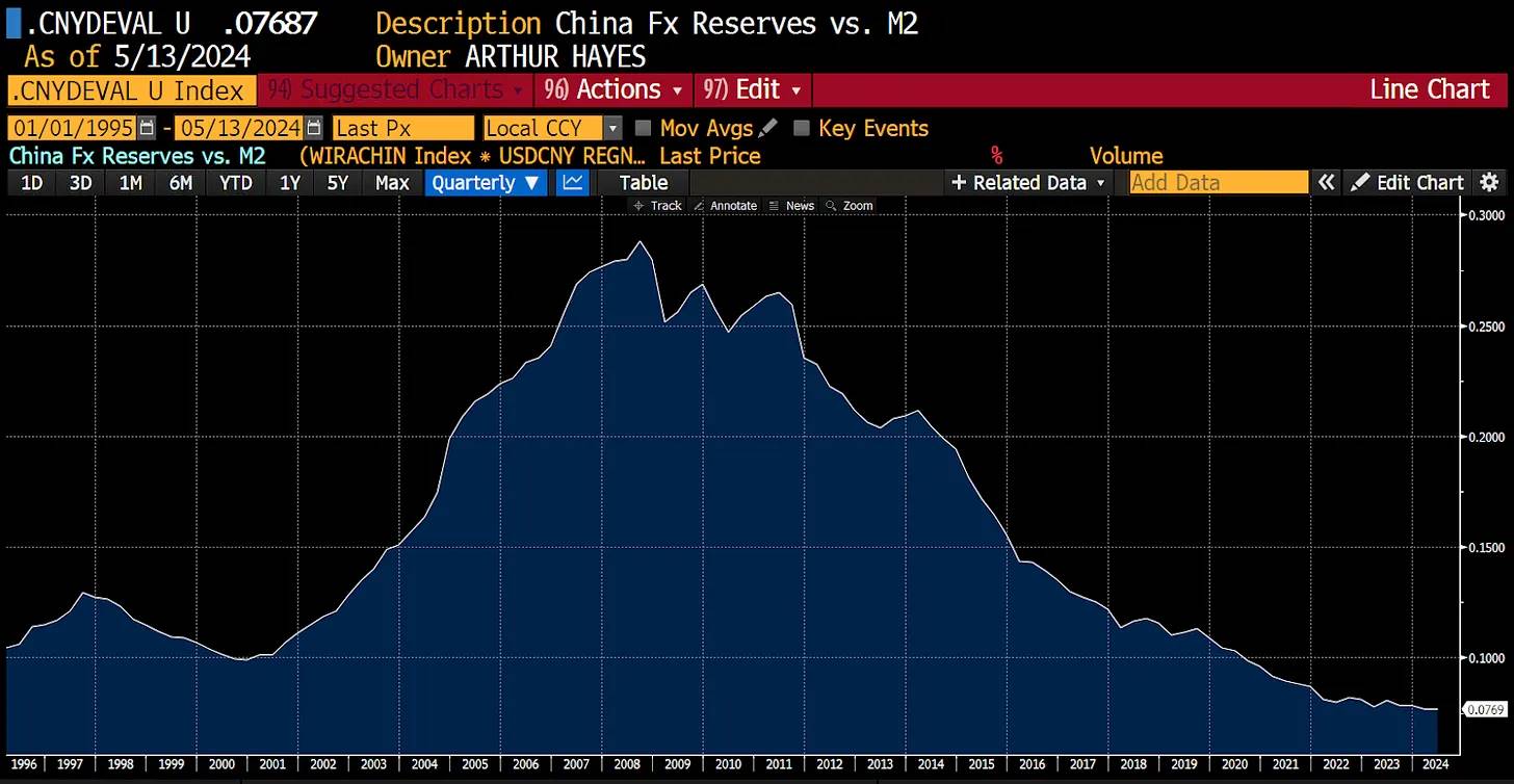 为了创建上图,我将中国的 M 2 (人民币货币供应量)除以报告的外汇储备。在 2008 年的高峰期,人民币有 30% 的外汇储备支持,主要是由美国国债和其他美元资产组成。目前,人民币仅有 8% 的外汇储备支持,这是自有数据以来的最低水平。