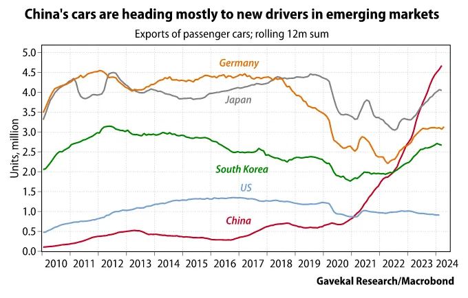 正如你所见,中国和日本在新兴的乘用车出口市场上势均力敌。我以此作为全球出口竞争的一个例子。鉴于每年购买的汽车数量,这是最重要的出口市场。此外,全球南方国家年轻且在增长,未来几年他们的人均汽车数量将增加。