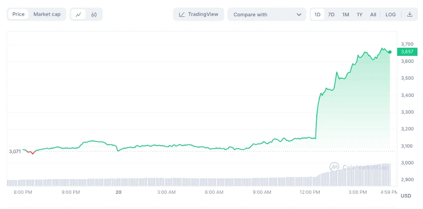 以太坊的涨势则更令人吃惊:在北京时间凌晨 3 点左右,受到 SEC 对于现货以太坊 ETF 新闻的影响,以 太坊的涨幅几乎是拔地而起,在短短 3 小时之内从 3150 美元左右飙升至 3600 美元以上,截止写作时间现报 3653 美元, 24 小时上涨幅度达到 19.03% 。