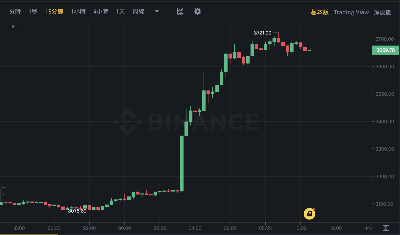 虽然 SEC 的最终立场尚未确定,但以太币价格受此消息刺激大涨。根据 币安现货市场数据 ,今晨 3 点消息发布后,以太币在 15 分钟内从 3,150 美元附近上涨超过 6%,随后一路狂飙,撰稿时最高触及 3,721 美元,近 12 小时内涨幅接近 20%,现报 3,659.78 美元。