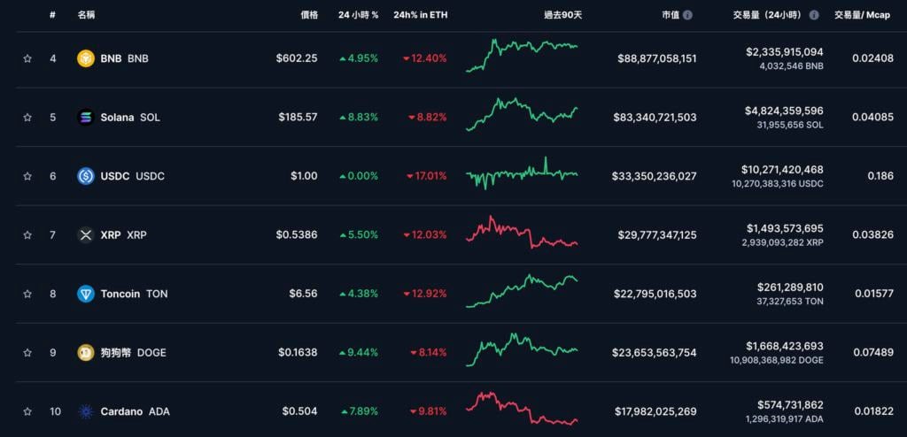 其他前十大代币也呈现普涨趋势,涨幅最大的是 DOGE 和 SOL,近 24 小时分别上拉 9.44% 和 8.83%。其他代币也有 4~7% 的涨幅。