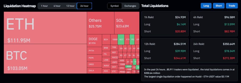 在以太坊暴涨的背场下,据 Coinglass 数据 显示:过去 24 小时,加密货币全网爆仓金额超过 3.5 亿美元,其中主爆空军达 2.72 亿美元、总共有超 8.5 万人遭清算。