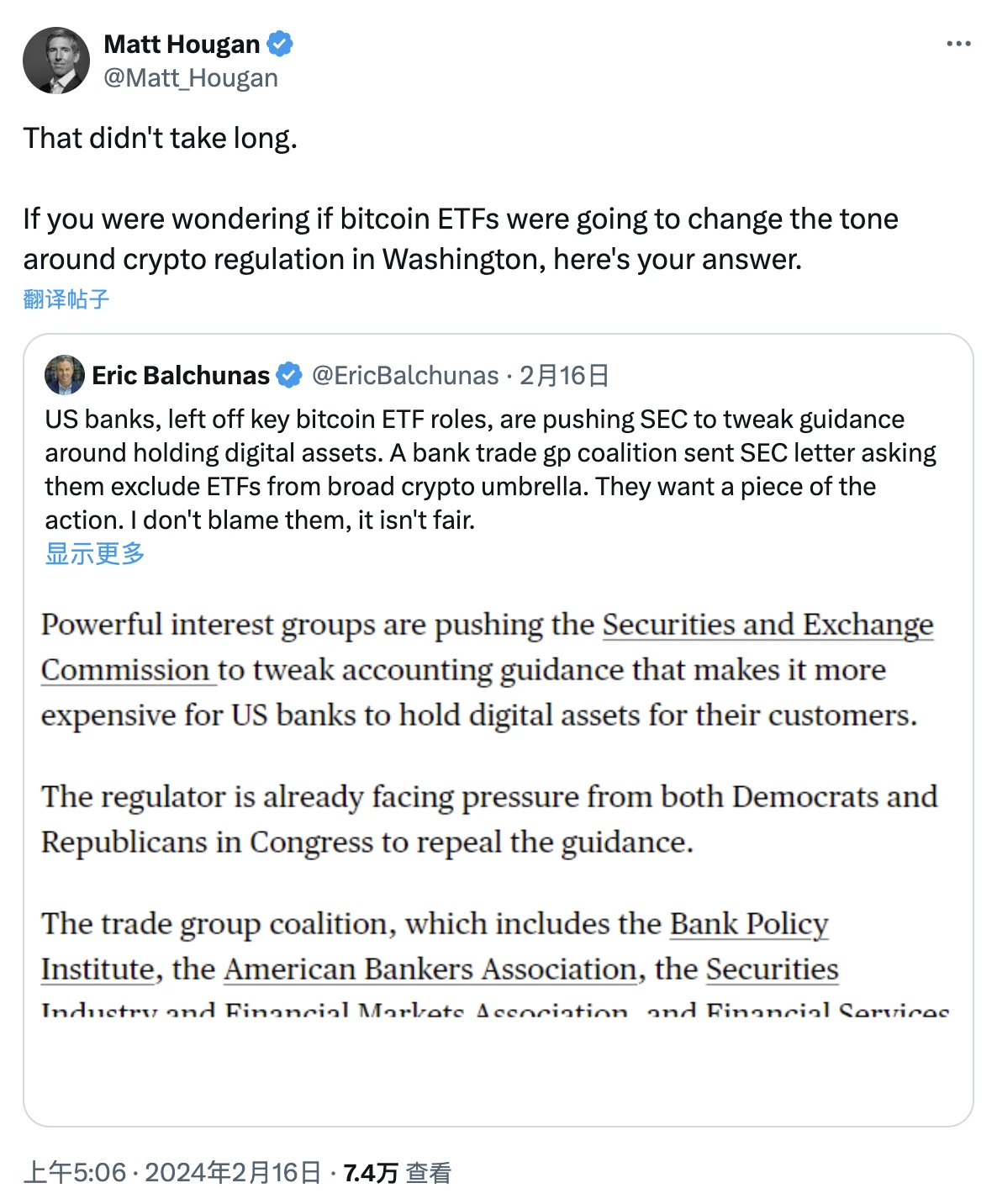 这并非仅是猜测。在现货比特币 ETF 推出之时,一系列银行游说机构(银行政策研究所、美国银行家协会、证券业和金融市场协会以及金融服务论坛等等)曾联合向 SEC 发出了一封反对 SAB 121 的 信函 。我当时也曾在 X 上解释过:“如果你想知道比特币 ETF 是否会改变华盛顿对加密货币监管的态度,这里有你的答案。”