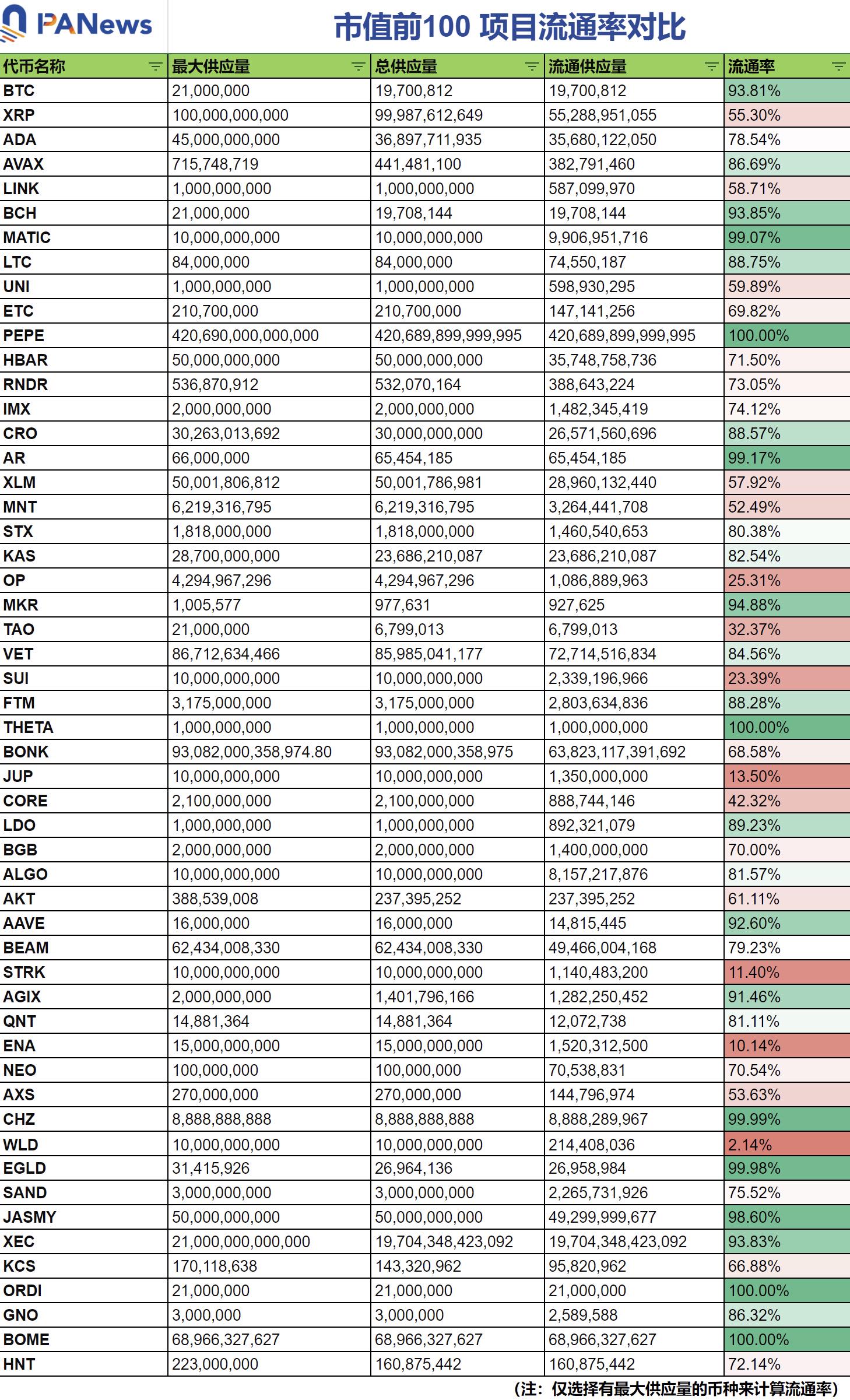 据PANews统计,截至5月21日,市值排名Top 100中流通率低于50%的项目有7个,其中JUP、STRK、ENA和WLD均低于20%。而据今年5月初CoinGecko的研究数据显示,市场上低流通量的加密货币在市值前300名中占据比例达21.3%,这意味着每5个加密货币中就有1个的大部分代币供应尚未解锁,导致其市值与完全稀释估值 (FDV) 的比率低于0.5。大多数低流通量加密货币都是市场上相对较新的产品,且即将到来的代币解锁带来的供应过剩预计将继续给加密市场带来压力。