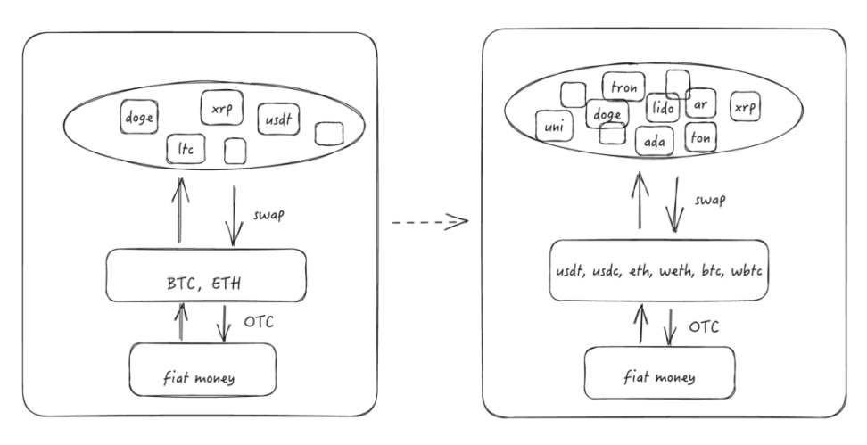 利用全球化的去中心网络,各国的金融服务将直面零距离竞争。BTC 的点对点的现金系统,也是金融服务的一种。在这些更关联法币的资产下,稳定币为基石做底层货币更加便捷。