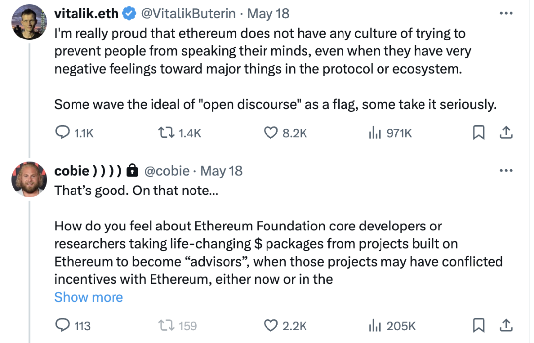 Vitalik 随后赞赏了以太坊社区的「公开讨论」。但就在一条这样主题的 thread 里,加密社区传奇 influencer Cobie 回复他「你对以太坊基金会的核心开发者或研究人员从构建在以太坊上的项目中获得改变生活的巨额报酬并成为顾问有何感想?而这些项目现在或将来可能与以太坊有利益冲突,例如 —— 当然纯粹是理论上的 —— 假设是 EigenLayer。」