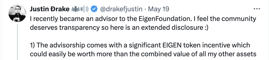 Cobie 显然知道些内情,而非随意提到 EigenLayer。因为就在他发文询问后不久,以太坊基金会核心研究员 Justin Drake 就在 X 上发长文披露了他将成为 Eigen Foundation 顾问并获得数百万美元代币激励,「价值超过他个人其他所有资产的总和。」