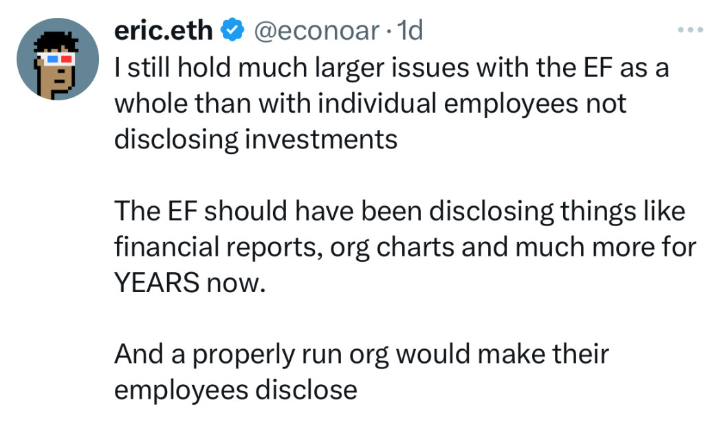 相比于个别员工不披露投资,我对以太坊基金会整体存在更大的问题。多年来,以太坊基金会本应披露财务报告、组织架构图等信息。一个管理良好的组织会要求其员工进行披露。