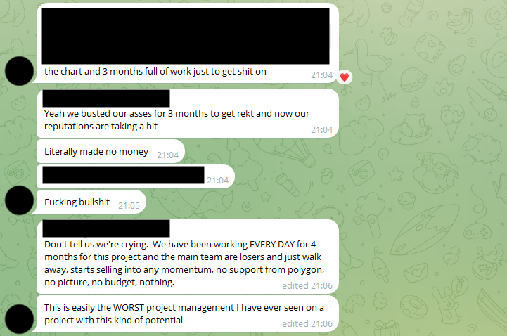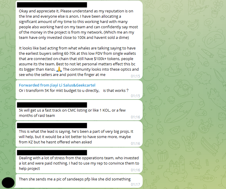 由于在交付项目后Rahul并没有被踢出群聊,这也让爆料人Rahul在接下来三个月中亲眼见证“有钱人是如何利用其他人的时间和金钱没有任何成本地进行恶意抛售、精神操纵与公然欺诈。” 表演开始