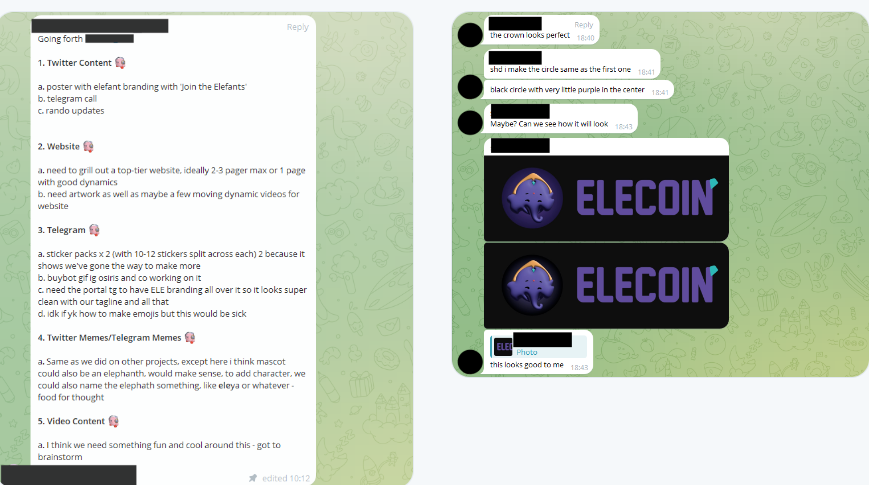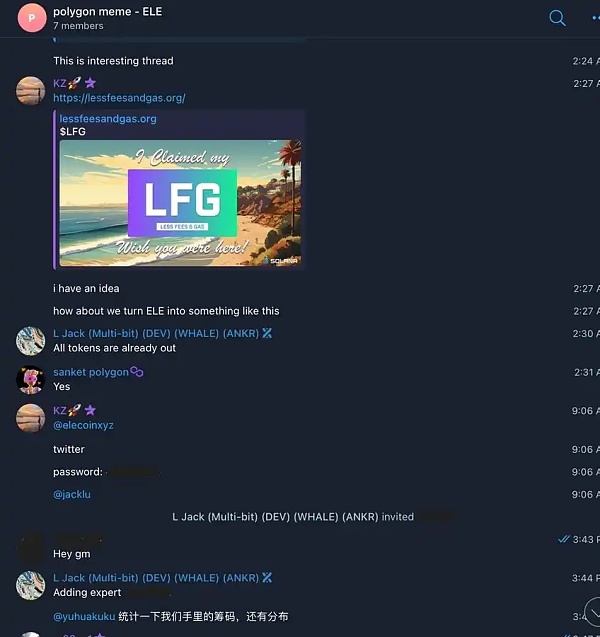 在由爆料人提供的上图中,聊天记录显示在ELECOIN正式推广前,内部团队正在进行一些准备工作,包括在TG群中沟通筹码分发、人员统计和Meme叙事等相关事宜,显然是在为攒局做准备。 攒局密谋造Meme