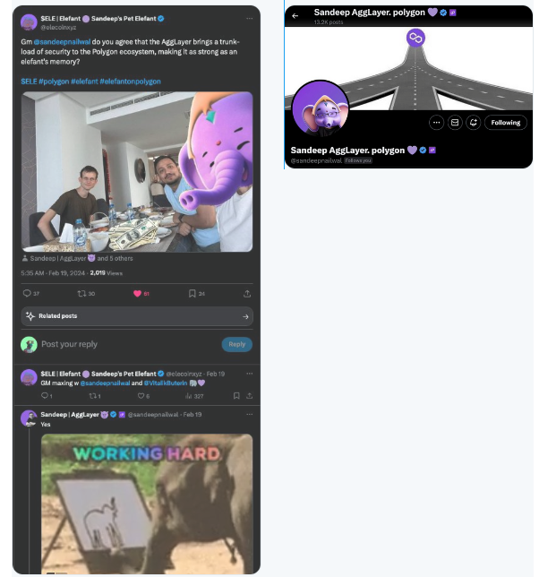 当然这一切都是提前计划好的,从Sandeep与ELECOIN官方账号的第一次互动到Sandeep将自己的推特头像换成大象Meme图(这有点像在模仿当时 Solana 创始人将头像换成 SillyDragon 所引发的 Silly 代币上涨),发帖者认为事件发展的每一步都经过ELECOIN乃至整个Polygon高层团队的精心设计过。