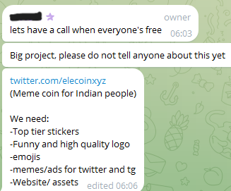 在2024年1月3日,许多KOL聚集在一个电报群中,计划以“印度人的Meme”的名义推广 Meme 币ELECOIN。 爆料人Rahul在推文中称该代币已于23年末进行“秘密TGE”,大部分代币供应已被内部人士获取。 同时项目方对所有开发者和KOL承诺尽快为其工作支付报酬(以USDC形式)。