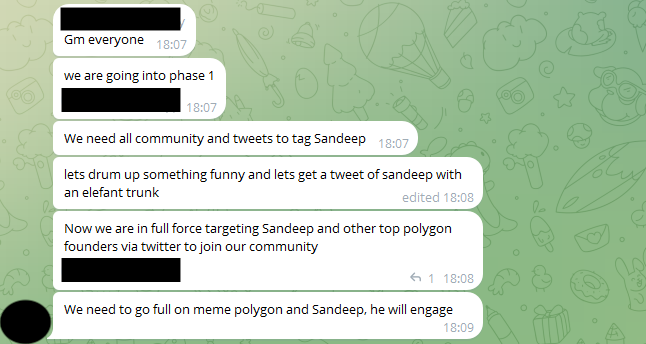 团队计划以Polygon创始人Sandeep的宠物大象作为媒介来推广ELECOIN的故事,并希望通过Sandeep发布宠物大象的照片来推动ELECOIN话题炒作。 并且这一想法获得Polygon“Top级别人士”的支持。