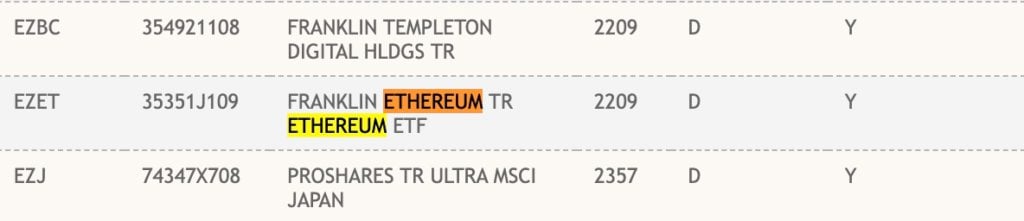 而在几周前,另一家资管巨头 Franklin Templeton 的现货以太坊 ETF「FRANKLIN ETHEREUM TR ETHEREUM ETF」(代码为 EZET)也同样已在 DTCC 列出,创建 / 赎回(Create/Redeem)一栏显示为 Y。