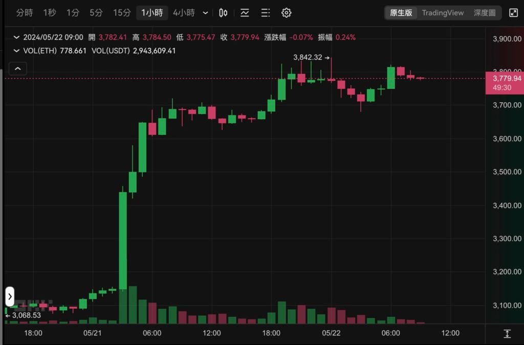 种种利好迹象,让高涨的以太坊持续上扬,今(22)日零点时最高触及 3,842 美元。截稿当下报 3,779 美元,尚未有明显的卖压涌现,请投资者小心可能的波动。