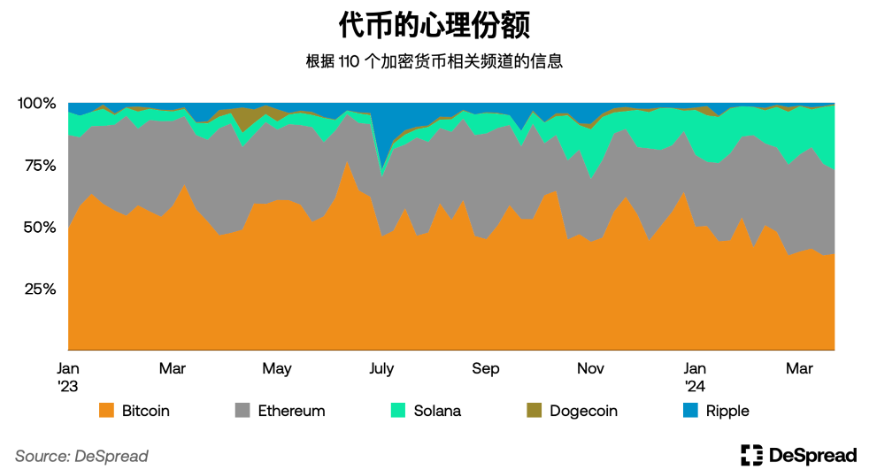 我们继续分析了每种代币在社区中被提及的次数,并将其定义为 “代币的心理份额”,指的是特定代币在总对话中所占的比例,心理份额数据高就代表韩国社区对该代币的兴趣较高。