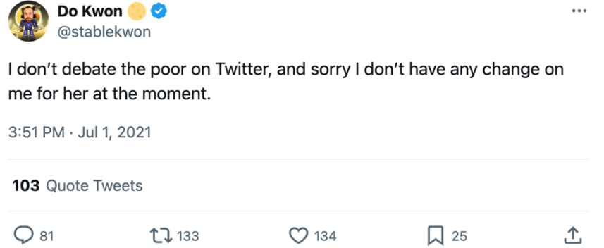 Luna 创始人 Do Kwon 经常无视 Luna 社区对于 LUNA-UST 机制提出的许多问题,甚至在推特上明示他不与乞丐辩论。不仅如此,他持续无视对于 “如何准备相当于 3 亿美元的 Anchor Protocol 利息?” 的问题,表明是 ”没有回答价值的问题“,反而引起了社区对于 Luna 破产的恐惧。回头过来,无视社区反馈的代价非常高昂。