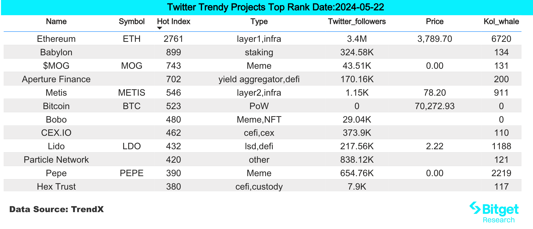 昨日,乐观情绪继续升温,美国证券交易委员会(SEC)对现货以太坊 ETF 潜在批准态度的大转变,令加密投资者者兴奋不已,推动市场继续上涨。山寨币市场受到以太坊积极发展的提振,市值前 200 大代币周二普涨。以太坊系 (ENS) 表现最佳,上涨 29.3% ,其次是 SKALE (SKL) 上涨 20.4% ,Metis (METIS) 上涨 16% , MEME 代币 PEPE 创下历史新高。同时,zkSync 计划本周进行代币生成,并于 6 月中旬进行空投。整体市场造福效应非常强。