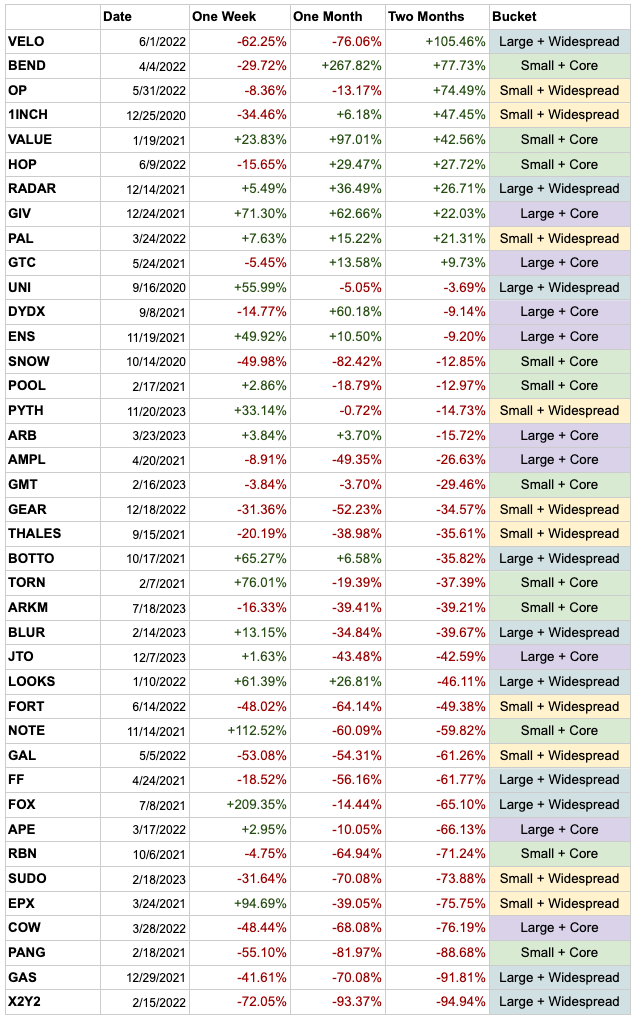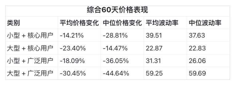我们可以得出一些有趣的见解: 大型 + 广泛用户组在价格表现和波动性方面表现最差。 总体上,核心用户组在价格表现和波动性方面优于广泛用户组。 空投规模对价格表现或波动性没有决定性影响。