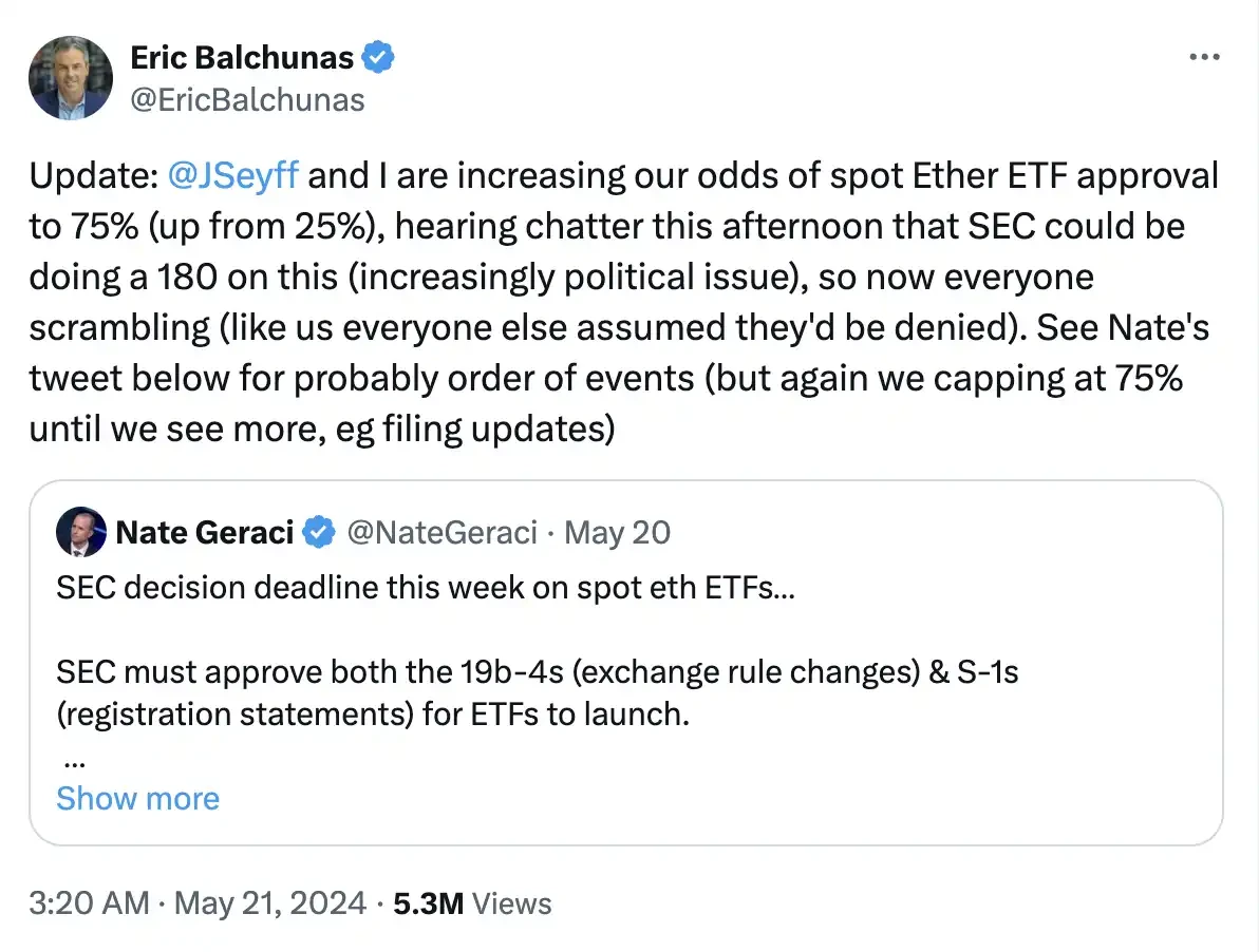 《华尔街日报》证实了这一消息,而 CoinDesk 也援引了三位知情人士的消息。大约在同一时间,Coinbase 机构的 David Han 在没有引用 19 b-4 消息的情况下撰写了一份报告,向上调整了他对以太坊现货 ETF 的前景。