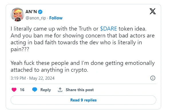 而更让人感到残酷的是,DARE 代币的投资者似乎并不关心 Mikol 本身的死活,而在讨论币价是否开始下跌。冷血的投资者们认为他在演戏,并在推特上写道: