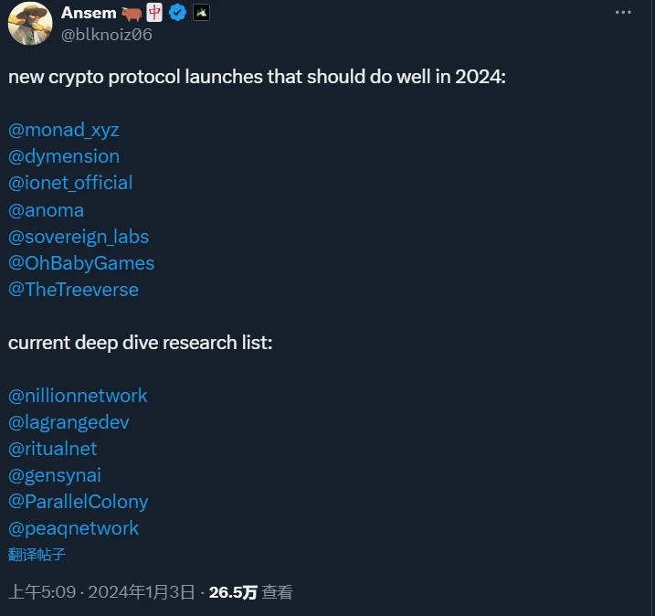 Odaily 星球日报观察到 2024 年初 Ansem 曾在 X 平台发推列举了认为会在 2024 年表现良好及深入研究的 13 个项目,那么将近半年发展,这些项目目前表现如何?我们能否从中找到一些参与机会?下面将一一介绍。