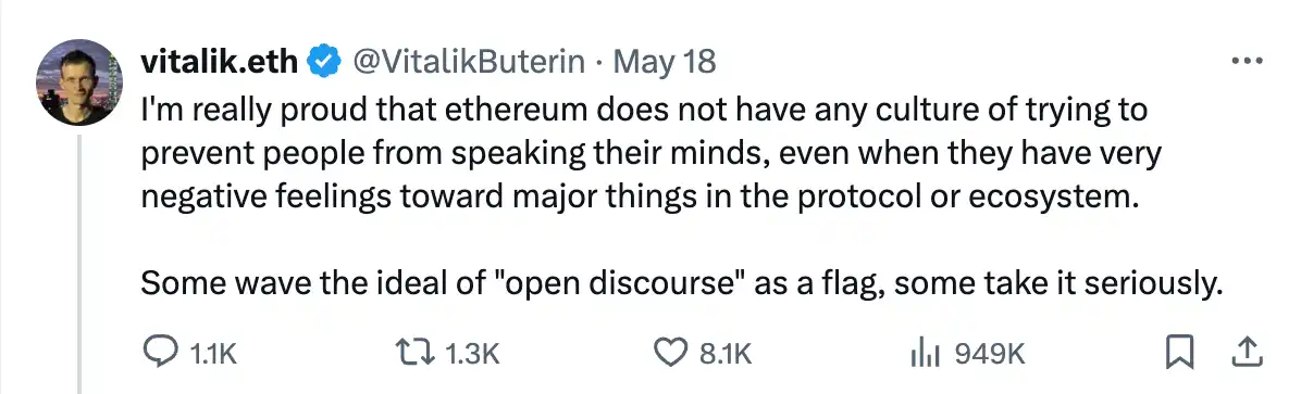 前两天,EF 研究员在社交媒体上就 MEV 议题对骂,Vitalik 出面调停,表示自己对以太坊生态这种开放自由的文化感到自豪,「以太坊没有任何试图阻止人们表达自己想法的文化,即使他们对协议或生态系统中的主要事物有非常负面的感觉。」