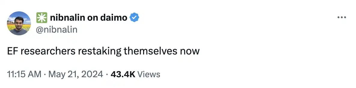 5 月 21 日,以太坊基金会(以下简称 EF)知名研究员 Justin Drake 和 Dankrad Feist 先后披露自己此前已成为 EigenLayer 顾问,并将拿到「可能超过自己现有财富总和」的 EIGEN 代币作为报酬。在社区看来,这种「既要又要」的行为吃相实在难看,还有人戏称 EF 研究员「正在把自己『再质押』化」。