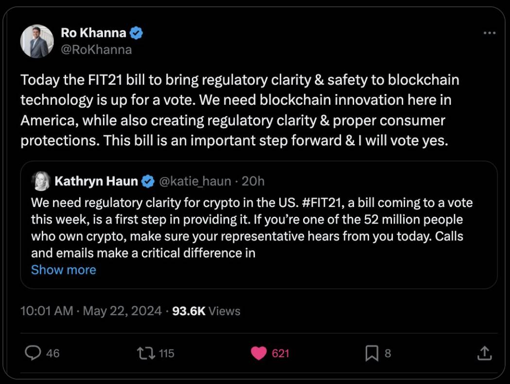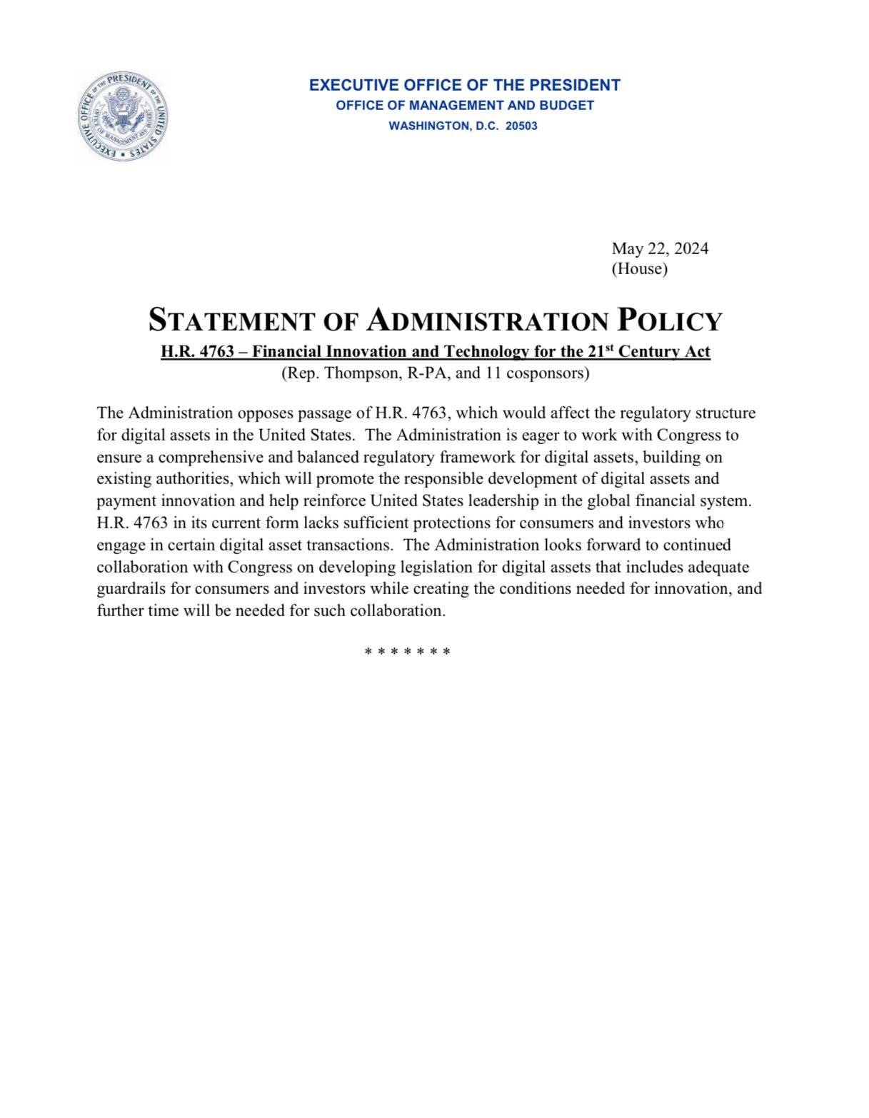美国众议院对 FIT 21 进行投票。拜登刚刚表示,他希望制定全面的加密货币法规。那么,