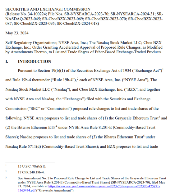 事实正如市场所料,时间来到5月24日,据官方文件显示,美国证券交易委员会(SEC)已批准纽交所、芝加哥期权交易所、纳斯达克关于现货以太坊ETF的计划,即发行人的以太坊现货ETF 19b-4(交易所规则变更)申请。