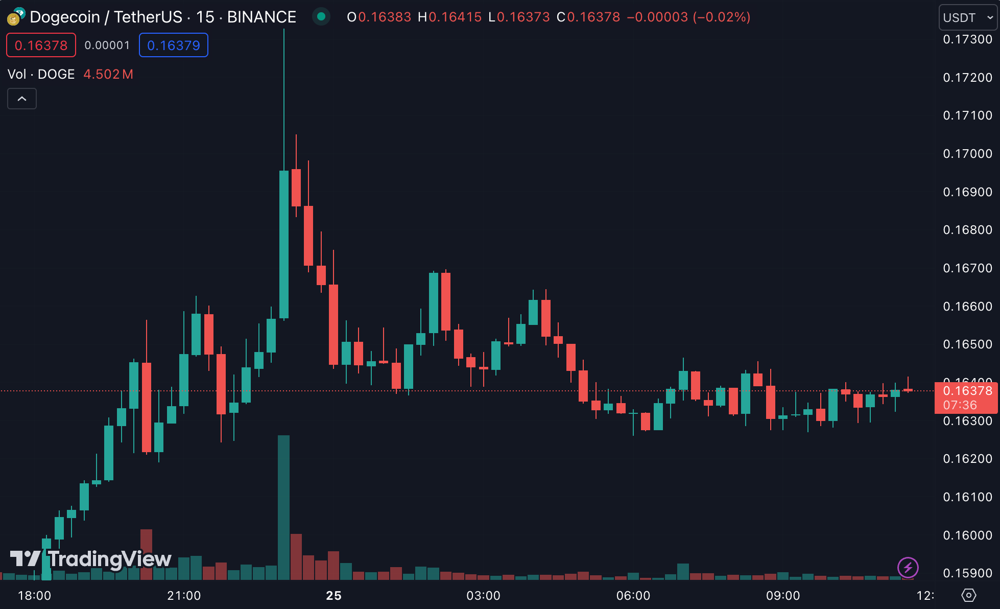 马斯克悼念狗狗币本尊 Kabosu 的推文发布的几分钟后, $ DOGE 价格一度飙涨近 5% 至最高 0.17328 美元,但随后就𫔭始下滑,撰稿当下报 0.16378 美元,近 24 小时上涨 2.4%,现排名市值第 9 大加密货币,并稳居迷因币市值王者。
