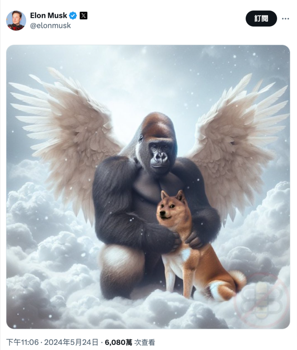 不久后,马斯克再用他拥有 1.8 亿跟随者的 X 帐号,贴出一张「在天堂的大猩猩 Harambe 抱著 Kabosu」的图片,并 表示 :