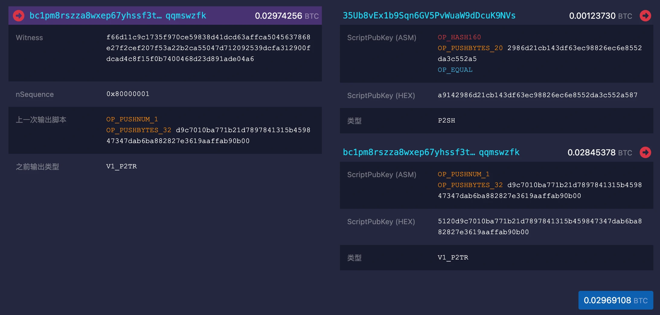 下面是一个 P 2 TR 交易,可以看到这个交易多了一个 Witness 部分。它的作用是用来验证交易的合法性。使用 Witness 代替 ScriptSig 之后,验证合法性的方式还是一致的,即通过使用公钥来解密 Witness 的签名,验证交易的内容是否一致。只有节点需要验证交易合法性的时候才会去请求 Witness 的信息。现在免费使用 ZAN Node 服务(访问 ZAN.TOP)即可稳定高速的连接到 BTC 网络。