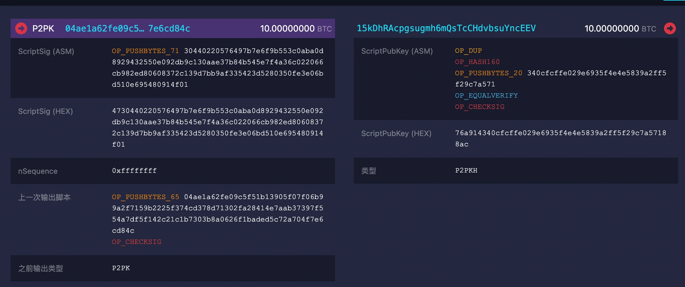 下面是一个典型的 P2P K 类型的交易,其中 04 ae 开头的地址想要给 15 kD 开头的地址转 10 个 BTC。04 ae 地址的账户需要向链上的其他人表明自己确实拥有这个账户的使用权(拥有私钥),那么他在这个交易中需要提供一个签名(ScriptSig)来证明自己的身份。