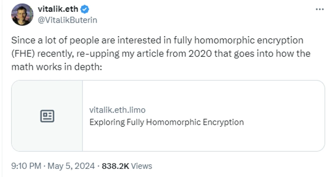 技术的发展并非仅靠其硬核的特性就能实现。要实现技术的成熟与持续进步,必须依托于持续完善的学术研发和积极建设的社区力量。在这方面,FHE 被成为加密学界的圣杯,其潜力与价值早已被广泛认可。2020 年,Vitalik Buterin 在《Exploring Fully Homomorphic Encryption》一文中,对 FHE 技术给予了高度的认可与支持。近期,他在社交媒体上再度发声,无疑再次强化了这一立场,并为 FHE 技术的发展呼吁了更多的资源和力量。与之对应的是,不断涌现的新项目、非营利性研究和教育组织,持续注入的市场资金,这一切似乎都在预示着一场技术爆发的序曲即将奏响。