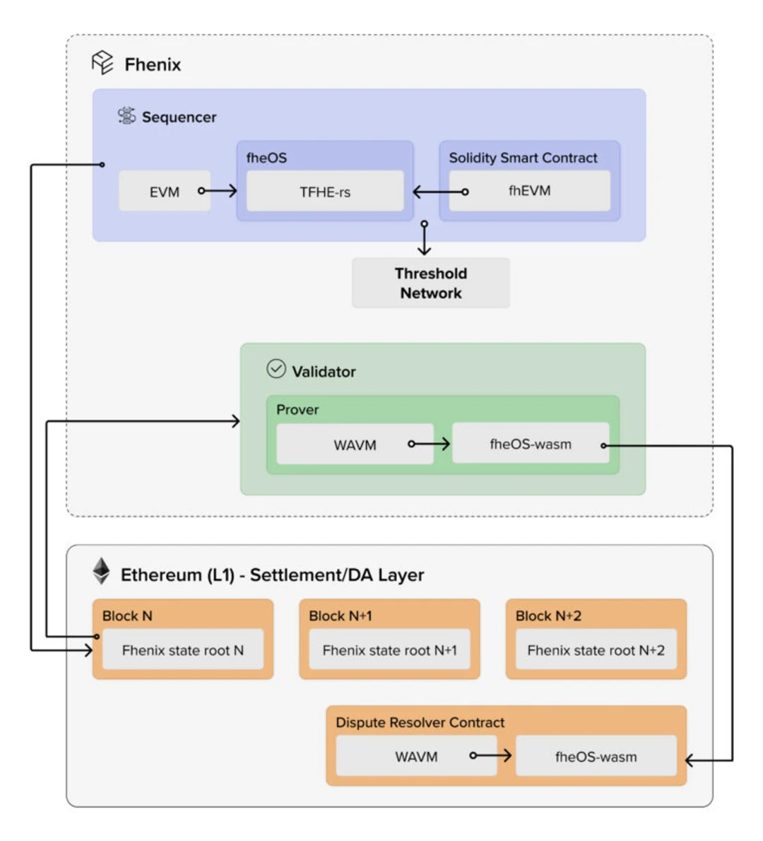 Fhenix 的技术栈主要包括以下几个关键组件:Arbitrum Nitro’s fraud prover 的变种,它可以在 WebAssembly 进行欺诈证明,因此,FHE 逻辑可以先编译成 WebAssembly 进行安全运行。核心库 fheOS 提供了将 FHE 逻辑集成到智能合约中所需的所有功能。阈值服务网络(TSN)是另一个重要组件,它托管着秘密共享的网络密钥,使用特定算法的秘密共享技术将其分割成多份来确保安全性,并且在必要时,负责解密数据等任务。