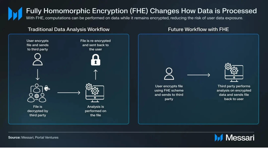 AI:AI 模型的训练依赖于数据集,当涉及使用个体数据进行训练时,确保个体敏感数据的安全成为首要前提。为此,FHE 技术成为 AI 模型训练个体隐私数据的理想方案,它允许 AI 在加密数据上进行处理,从而在不泄露任何个人敏感信息的情况下完成训练过程。