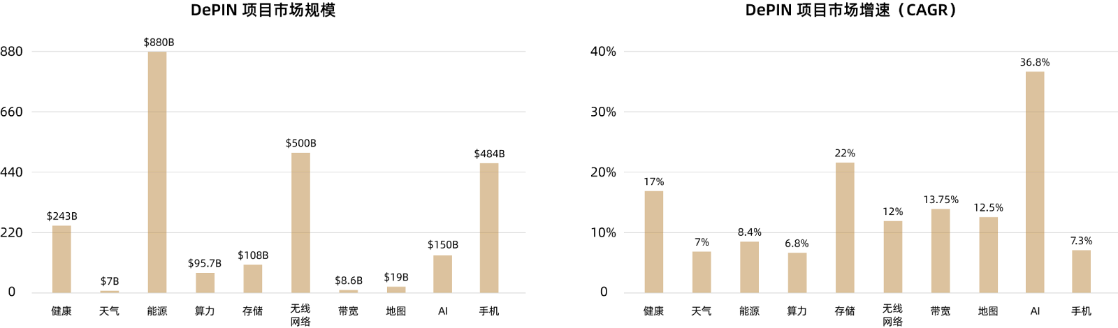 3. 市场需求与潜力 :新兴DePIN市场种类繁多,包括健康数据、气象、能源、带宽、AI和手机等,具有巨大的市场空间和高增长率。尤其是能源和手机市场潜力巨大,健康数据和AI市场的同比增长率也非常可观。