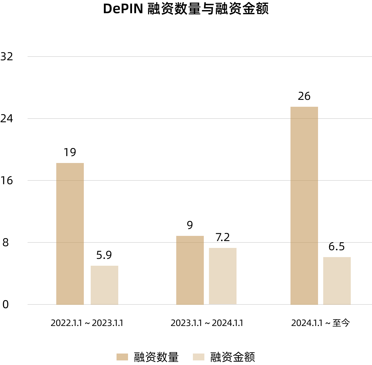 共计有 26 笔DePIN 项目融资,披露融资金额的平均融资额度为 6.5M,融资数量显著增加,融资额度有所下降。