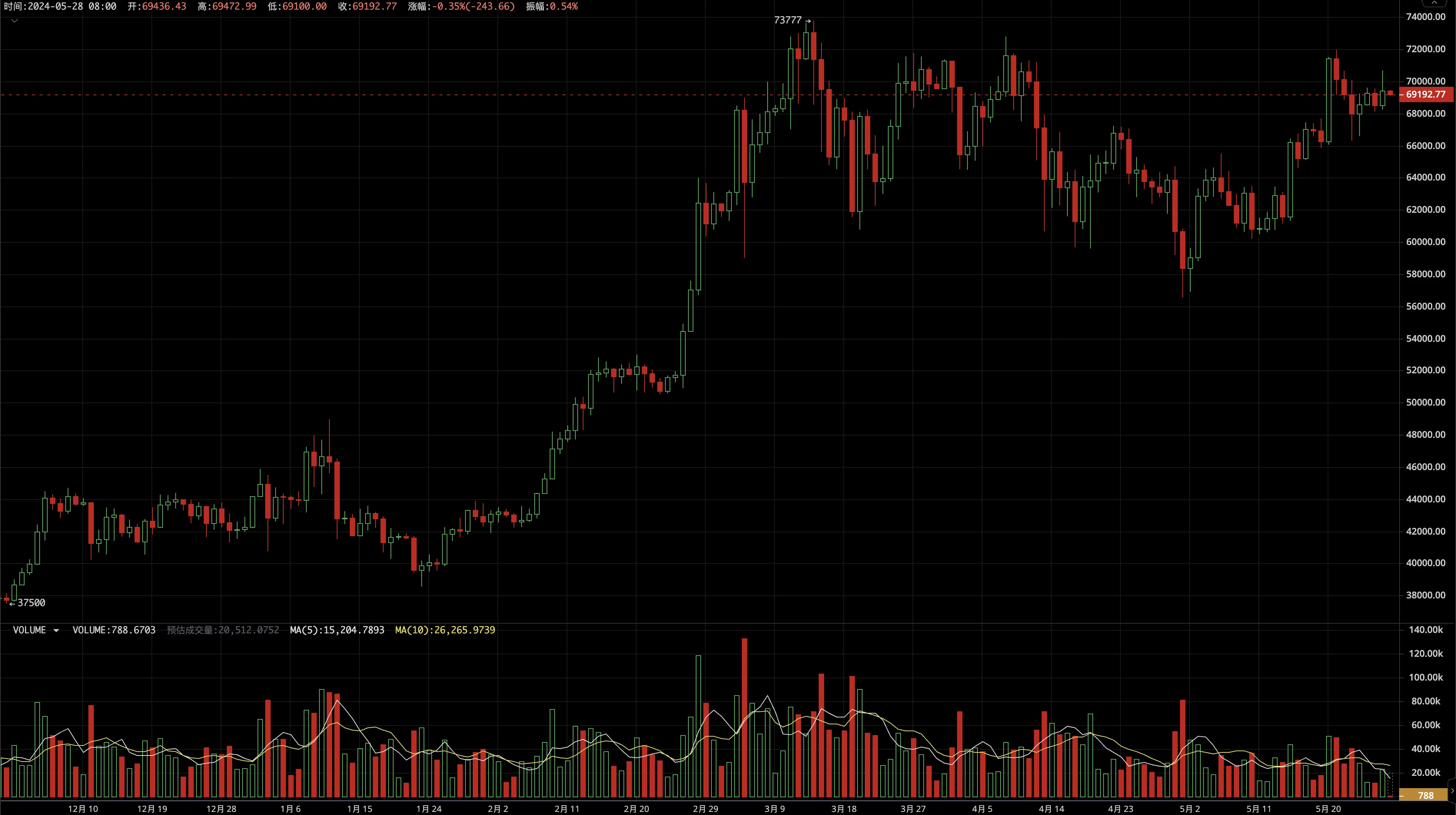 上周 BTC 依然延续了反弹趋势,最低 66060 美元,最高 71979 美元,接近 3 月份的历史最高点 73777 美元,最终涨幅 3.37% ,振幅 8.93% 。