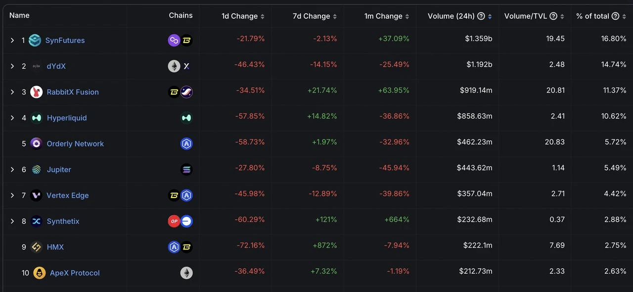 目前 SynFutures 日交易量超过了 13 亿美元,超过了老牌明星项目 dYdX 的 12 亿和 GMX 的 1.8 亿(未进前十),在交易量方面表现非常强势,给衍生品赛道带来了新的活力。